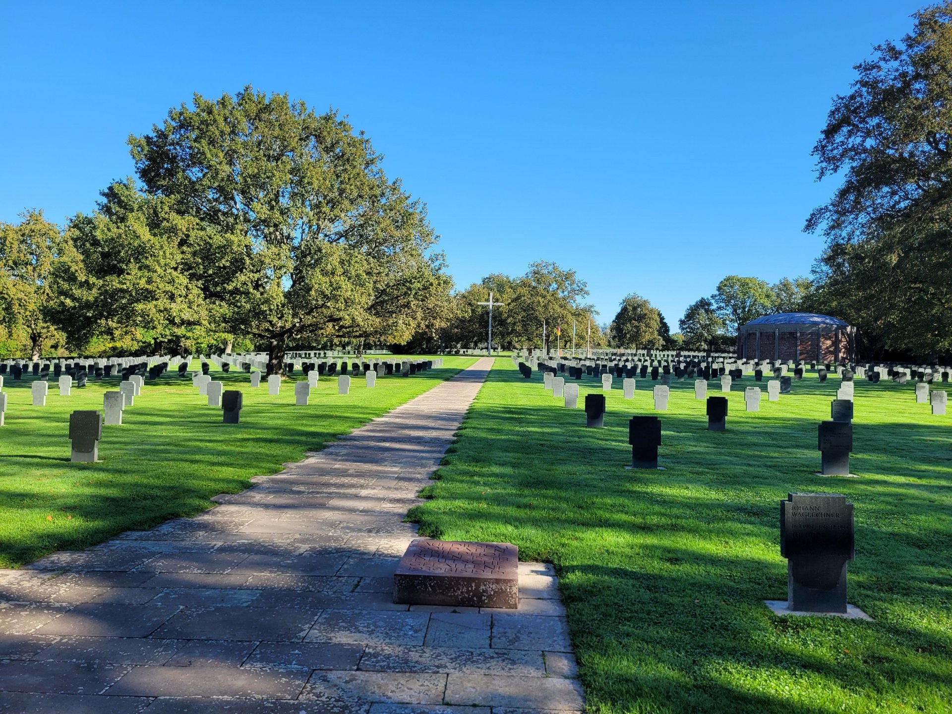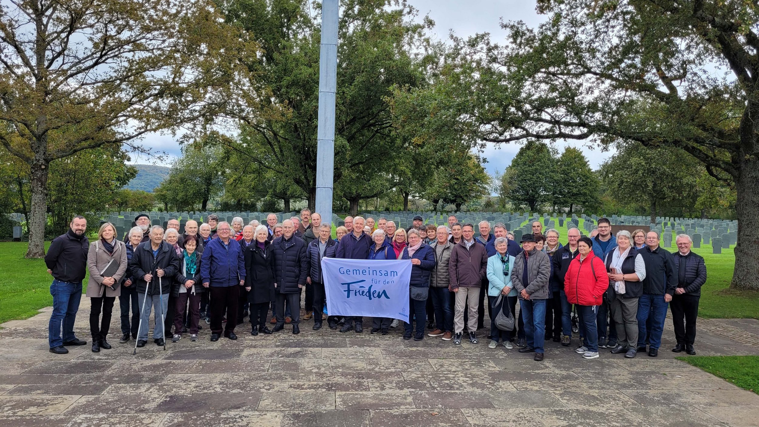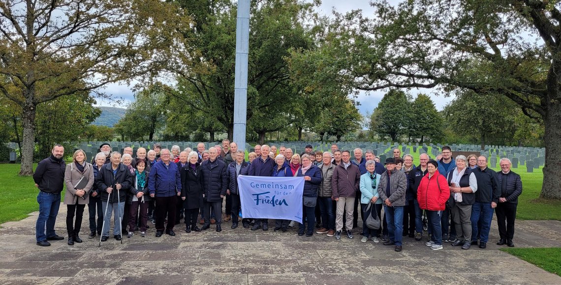 Joëlle Winter, die Leiterin der Albert-Schweizer-Jugendbegegnungsstätte des Volksbundes und ihr Vorgänger Bernhard Klein sind ebenfalls vor Ort und begrüßen die Mitglieder des Kameradschaftsvereines und des CSU-Ortsverbandes Ursberg. Nach einer Führung durch die Ausstellung und über das Gräberfeld versammelt man sich am Grab von August. Theo Waigel liest aus den letzten Briefen seines Bruders, der 1944 mit nur 18 Jahren in einem längst verlorenen Krieg sterben musste. Pfarrer Alois Lindner spricht ein Gebet. Blumen werden niedergelegt und eine Kerze angezündet. Anschließend hält Pfarrer Lindner eine Gedenkandacht für alle dort ruhenden Kriegsopfer am zentralen Kreuz des Friedhofs.