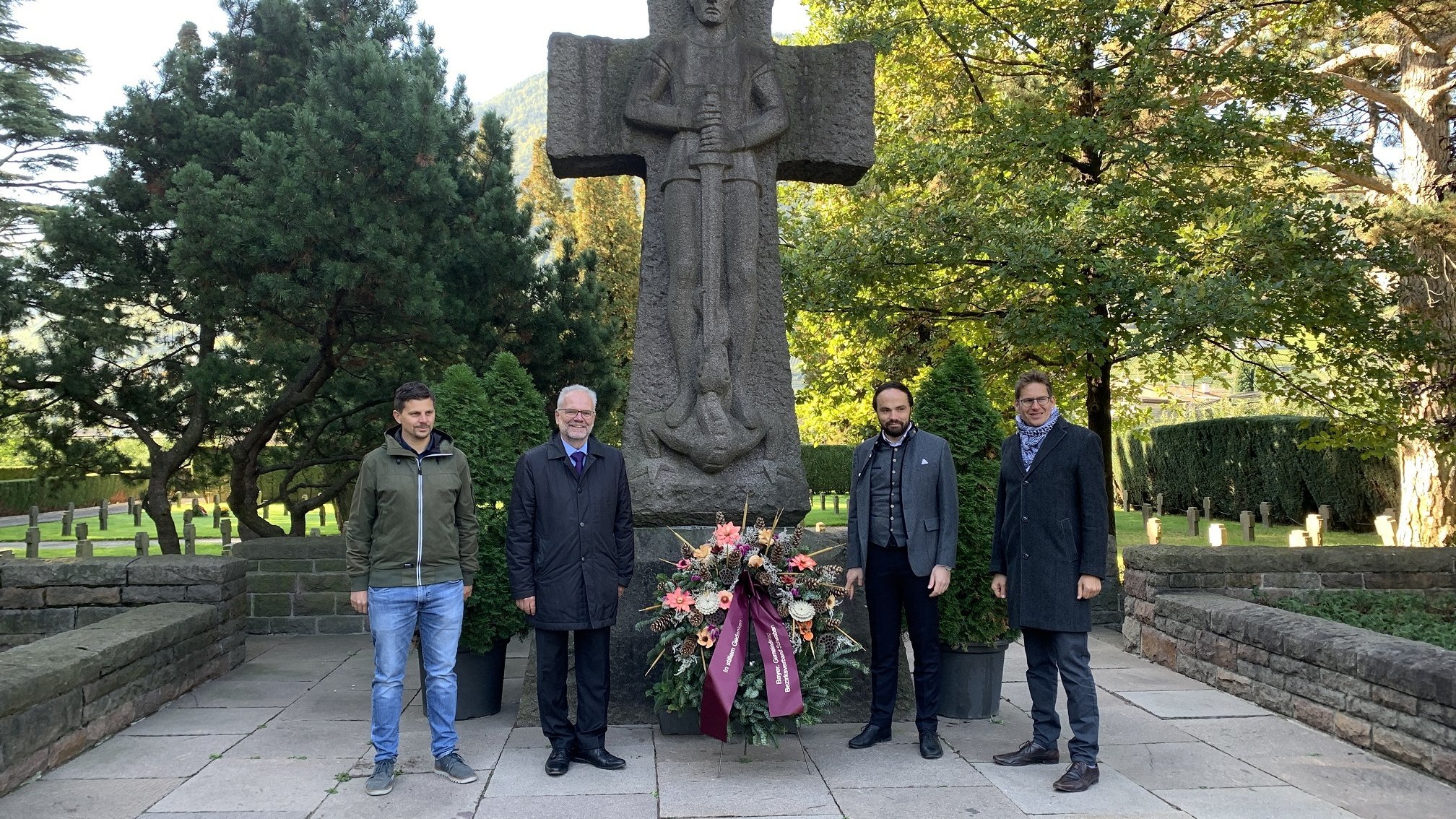 Gemeinsam für den Frieden. – Gemäß dem Leitspruch des Volksbundes wurde Mitte Oktober von den Vertretern des Bezirkes Schwaben im Bayerischen Gemeindetag und dem Südtiroler Landesrat Phillip Achammer auf der Kriegsgräberstätte in Meran der Opfer von Krieg und Gewaltherrschaft gedacht. Albert Telser, der Friedhofsverwalter des Volksbundes in Meran führte die Delegation über die Anlage und berichtete über einige Schicksale der 1058 deutschen aus dem Zweiten und der 1528 österreich-ungarischen Soldaten aus dem Ersten Weltkrieg, die hier ihre letzte Ruhestätte fanden. Regierungspräsident Dr. Erwin Lohner hob die Aktualität der Arbeit des Volkbundes Deutsche Kriegsgräberfürsorge e.V. hervor, dessen Bezirksvorsitz er in Schwaben bekleidet. Herauszustellen, was die Völker und Menschen verbindet, ist Kern des Europäischen Gedankens, so Lohner.