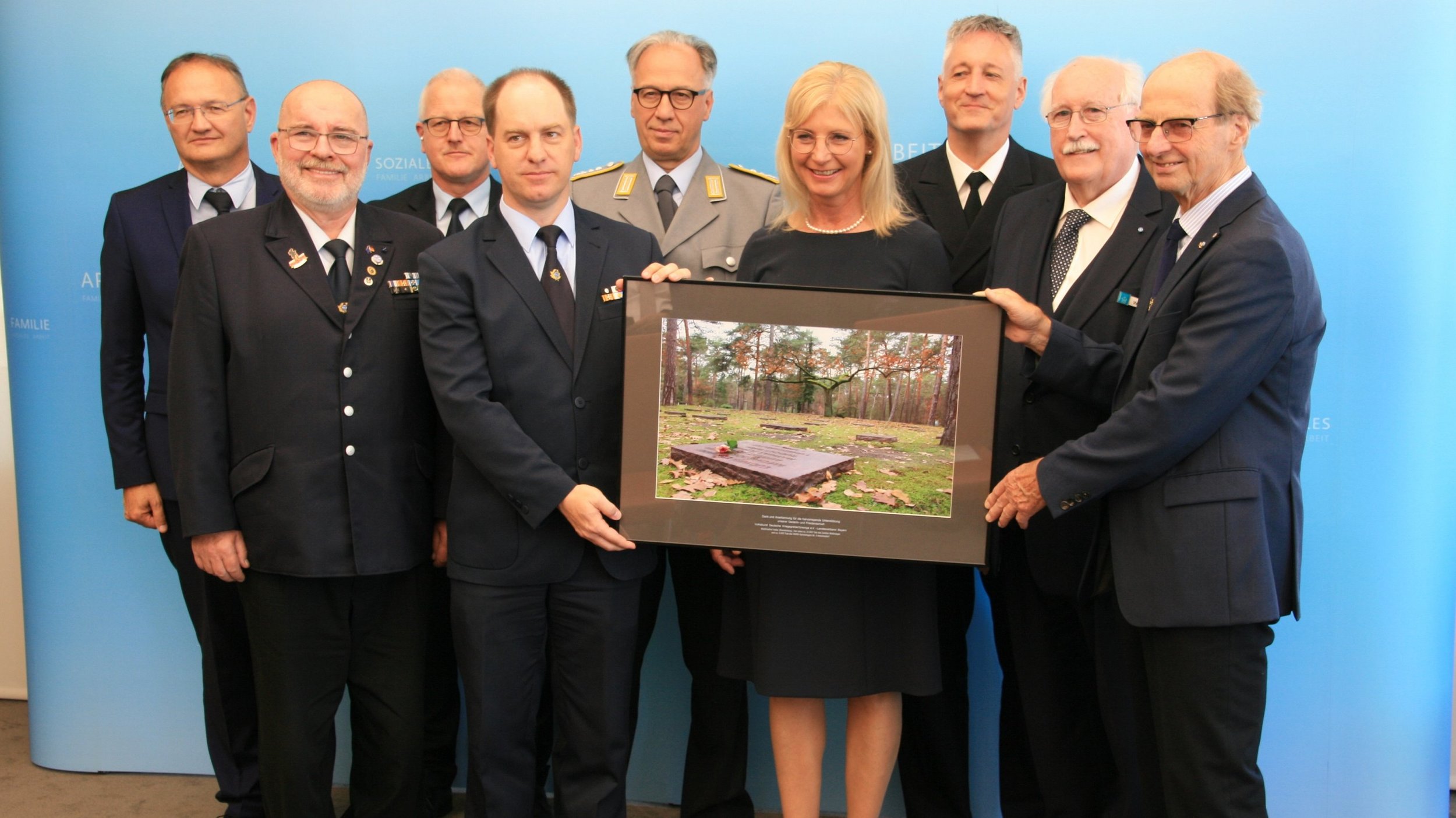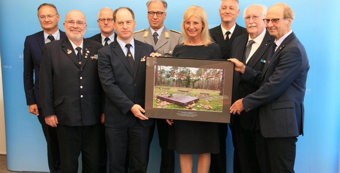 Als Zeichen der Verbundenheit und des Dankes für die Unterstützung überreichte Volksbund-Landesvorsitzender, Regierungspräsident a.D. Wilhelm Wenning, die Großaufnahme auch als Zeichen des Danks an Ministerin Ulrike Scharf sowie an das Landeskommando Bayern, die Arbeitsgemeinschaft der Reservisten-, Soldaten- und Traditionsverbände in Bayern, die Bayerische Kameraden- und Soldatenvereinigung (BKV), den Verband der Reservisten der Deutschen Bundeswehr (VdRBw) und den Bayerischen Soldatenbund 1874 (BSB). Mit sehr persönlichen Worten dankte BSB-Präsident Oberst a.D. Richard Drexl, dessen Onkel auf der Kriegsgräberstätte Halbe ruht.